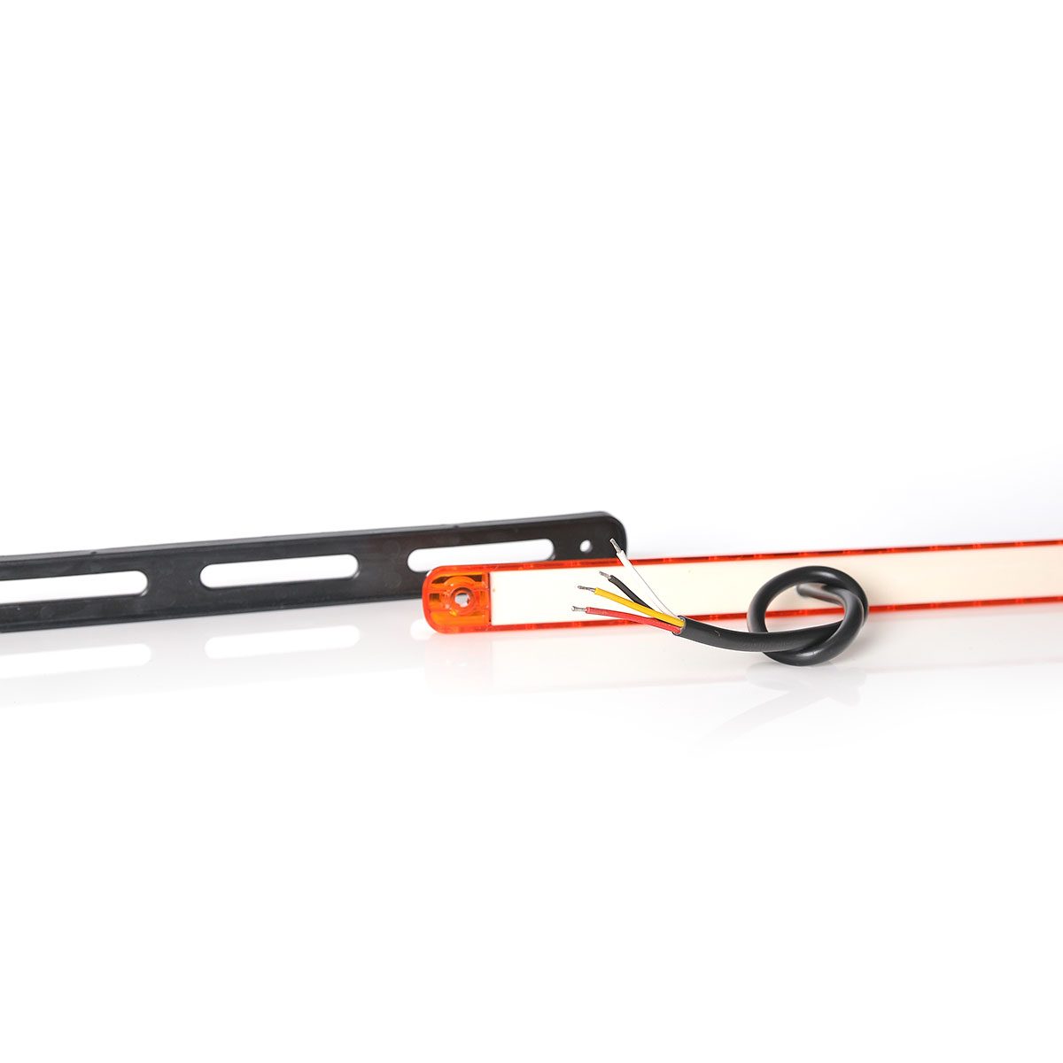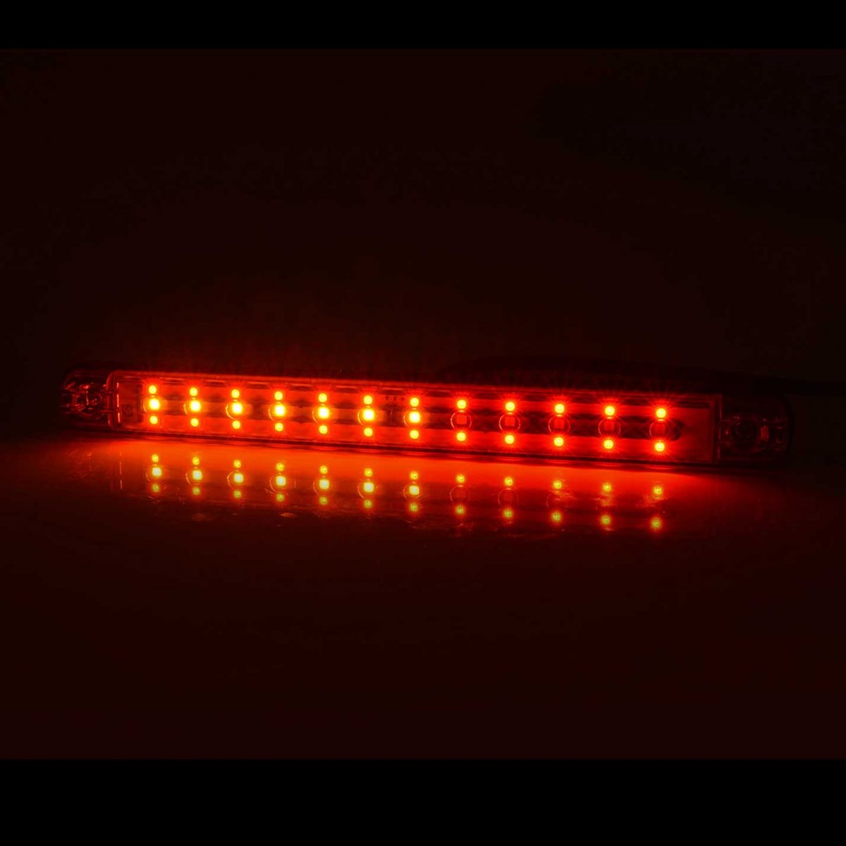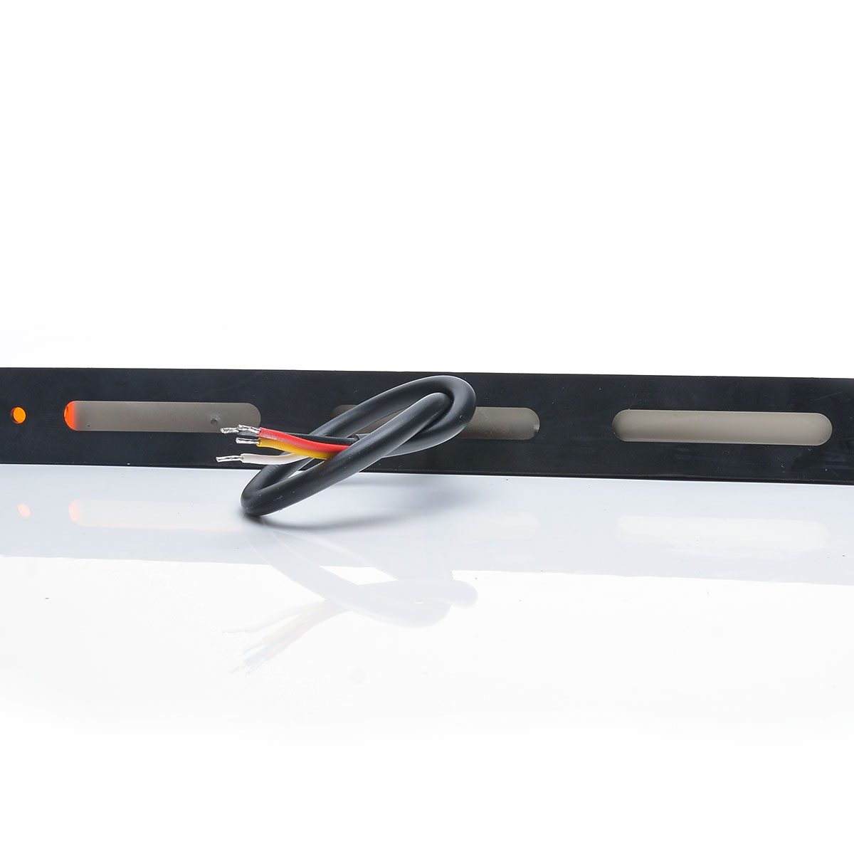 Två rader med lysdioder utgör bakljuset och när bromsljuset tänds ökar styrkan på dessa rader. I mitten ligger blinkljuset som sveper från sida till sida. Tänk på att montera den åt rätt håll så den sveper utåt.